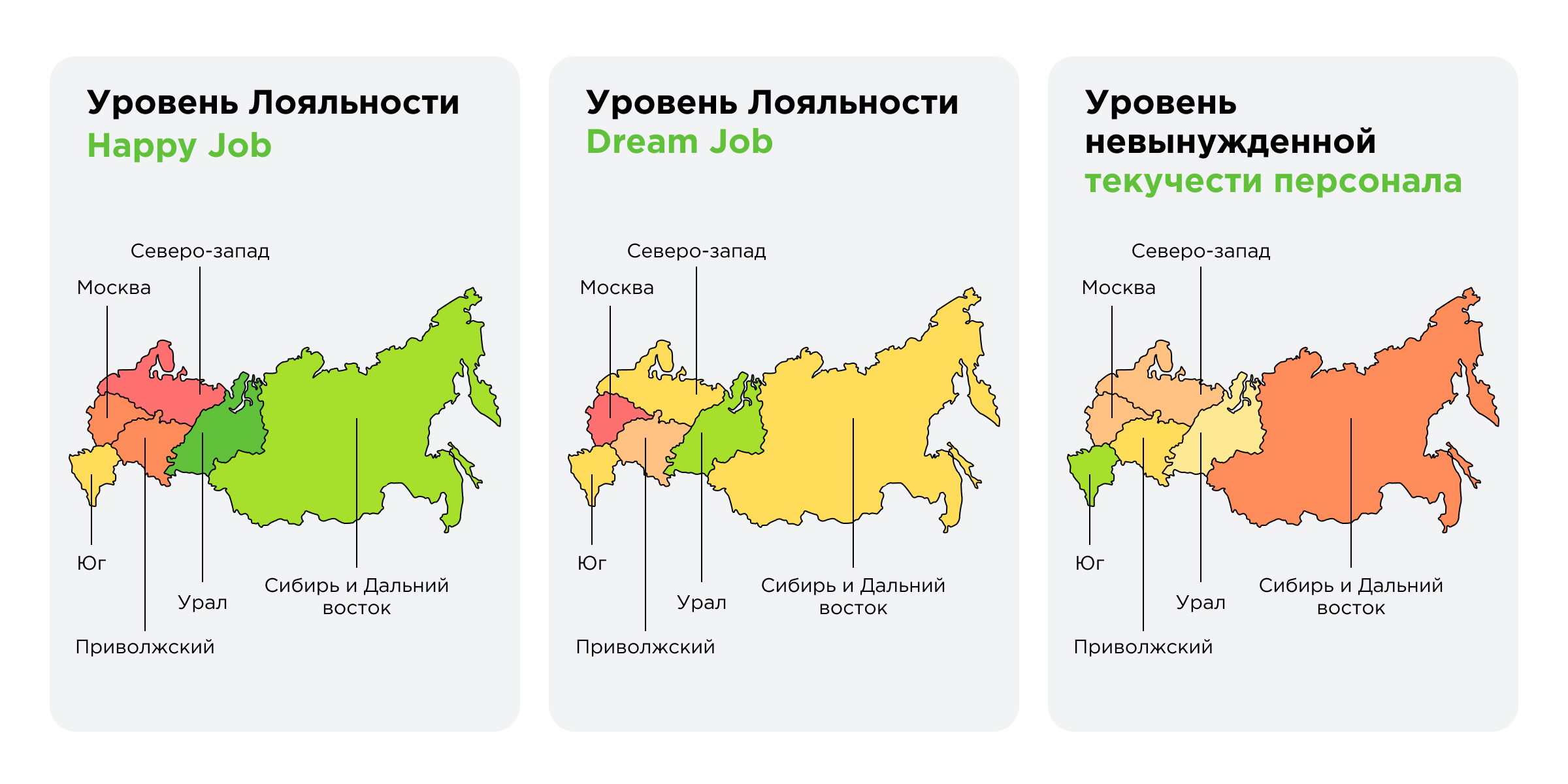 Ниже — схематичная карта наших крупных регионов. Возможности Happy Job и Dream Job позволяют смотреть ее вплоть до подразделений.