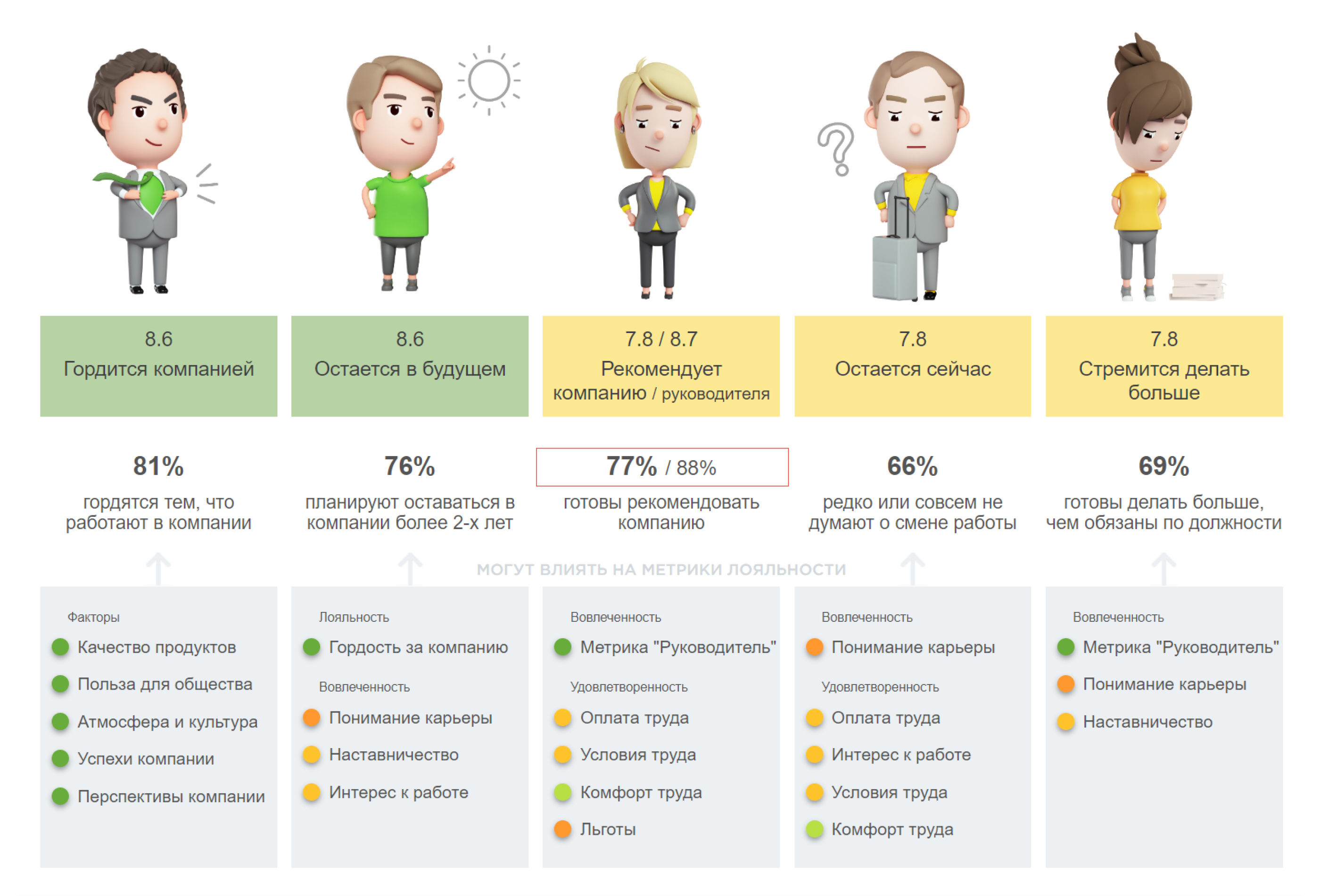 Также мы анализируем лояльность персонала по 5 граням: «Гордится компанией», «Остается в будущем», «Рекомендует компанию» / «Рекомендует руководителя», «Остается сейчас», «Стремится делать больше».