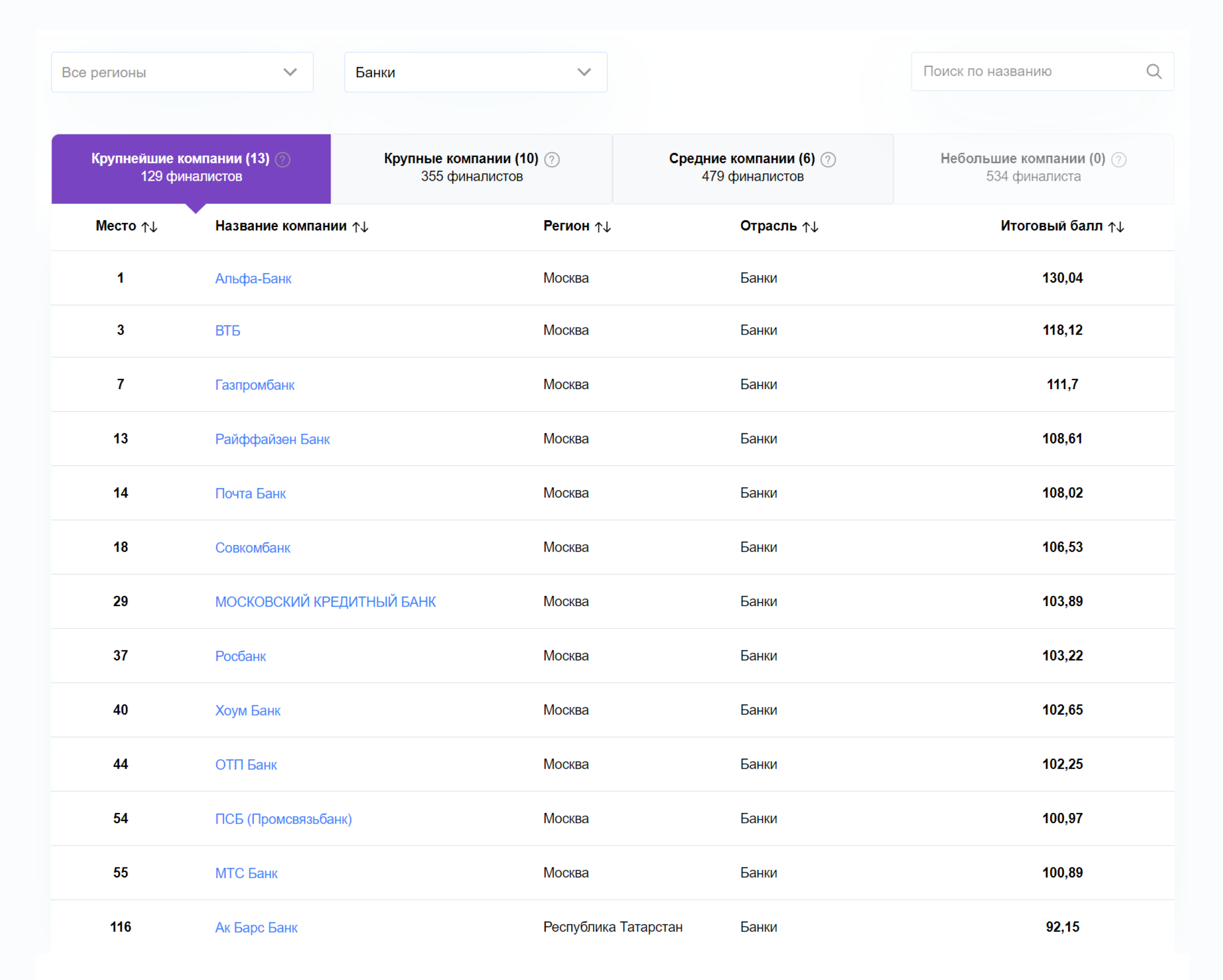 Далее компании делятся на 3 группы в зависимости от результата — от наивысшего до выше среднего. В группу с наивысшими показателями в 2023 жюри определило QIWI, Альфа-Банк, Сбер и Т-Банк.
