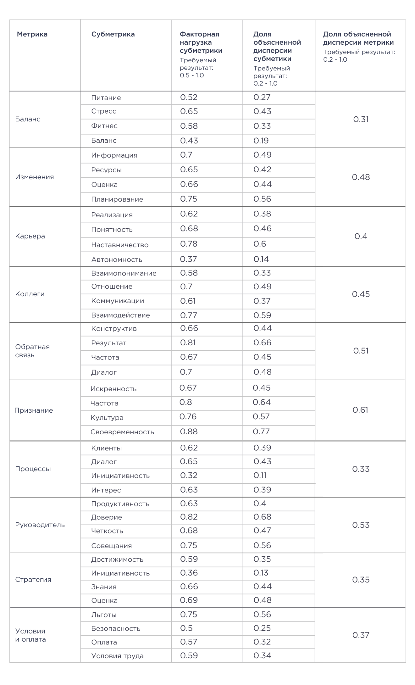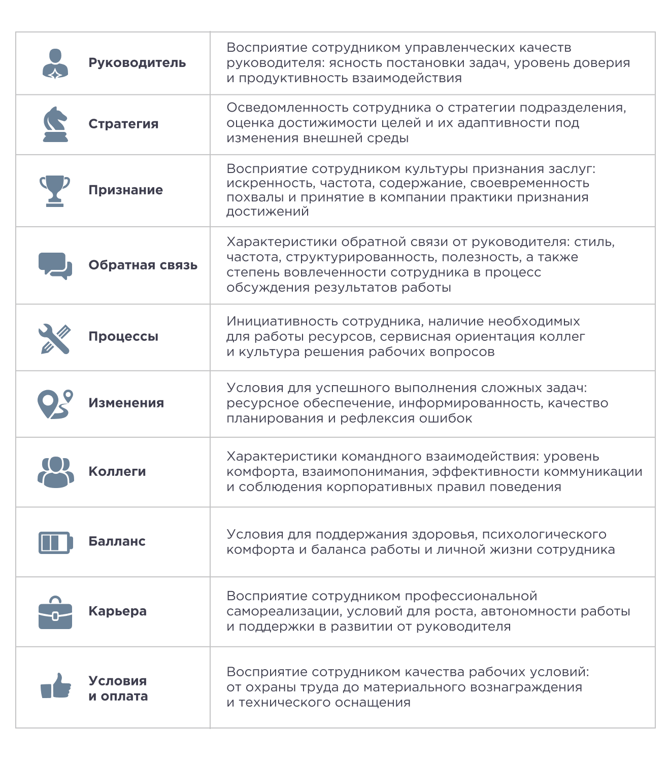 Каждая из метрик вовлеченности содержит 4 вопроса, которые позволяют более детально оценить весь комплекс факторов (субметрик), влияющих на продуктивность или мотивацию сотрудников.