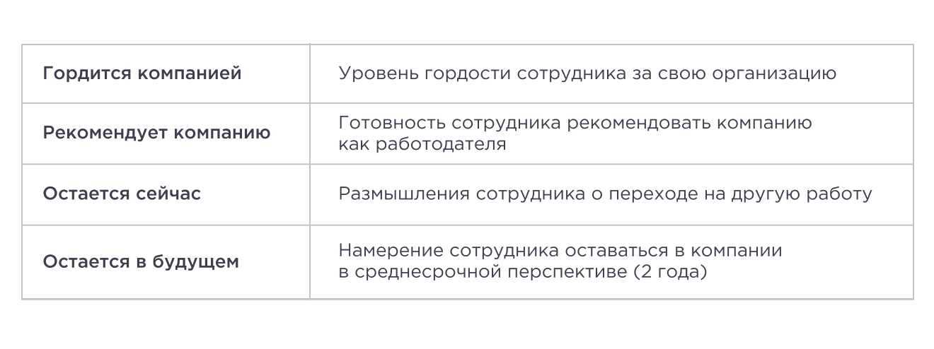 Ниже представлены 4 метрики лояльности, которые помогают понять, из чего формируется приверженность сотрудников компании: