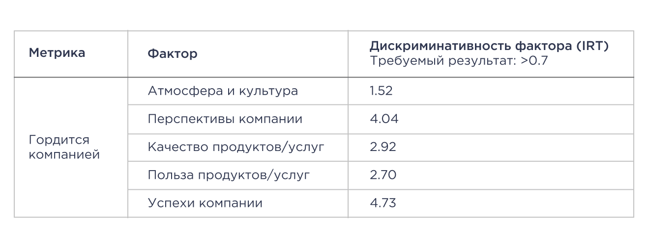 Результаты дискриминативности для факторов метрики лояльности «Гордится компанией»: