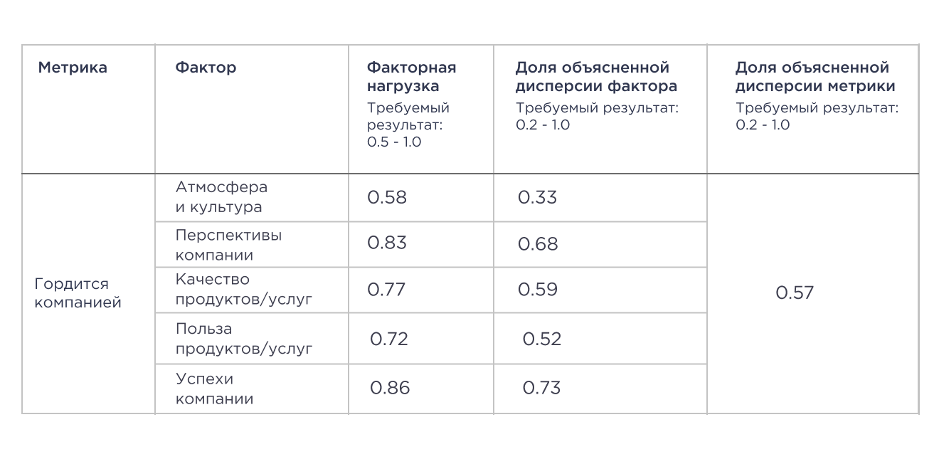 Результаты исследования конструктной валидности для факторов метрики лояльности «Гордится компанией»: