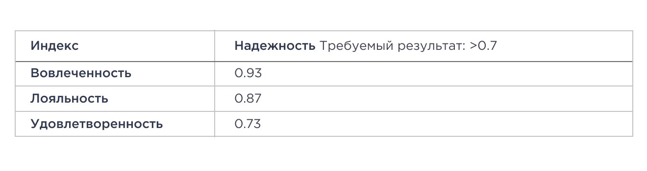 Для оценки надежности опросника Happy Job использовалась выборка из 96 822 респондентов разных функций и отраслей. Мы рассчитали Альфу Кронбаха для каждого индекса и каждой метрики опроса и получили следующие результаты: