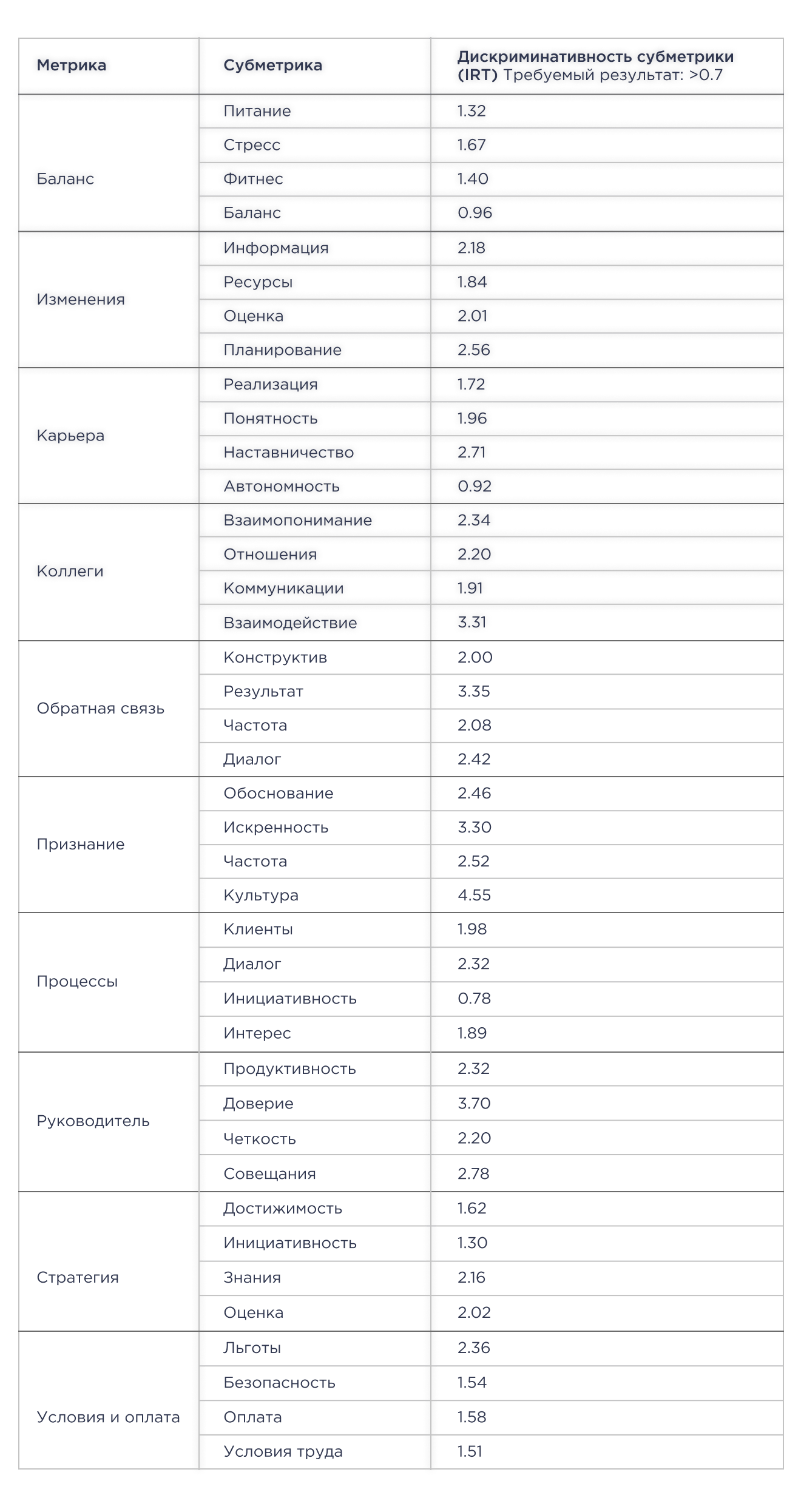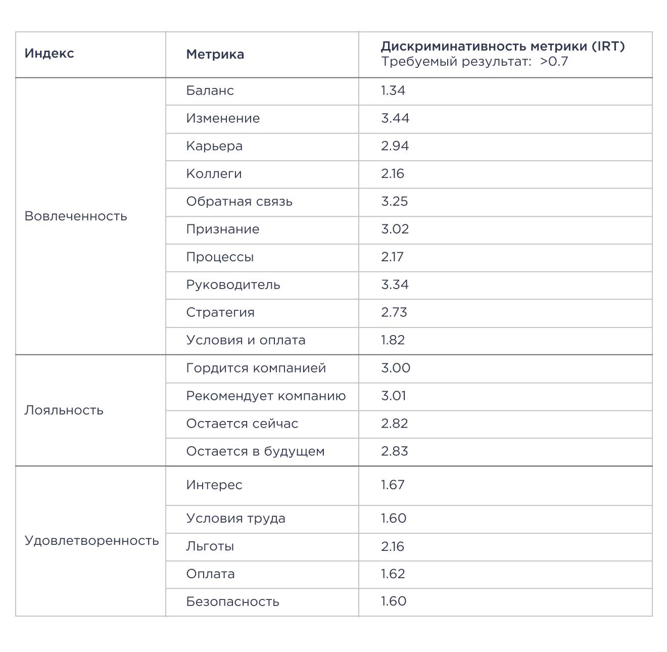 У всех метрик и субметрик вовлеченности и лояльности сотрудников высокие показатели дискриминативности (значения существенно выше порога 0,7). Это говорит о хорошей способности опросника различать респондентов с разным уровнем измеряемых качеств.
