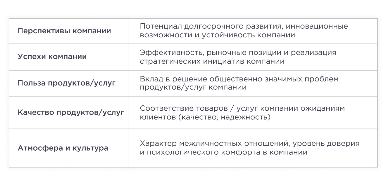 «Гордится компанией» — ключевая метрика лояльности и дополнительно измеряется по следующим субметрикам: